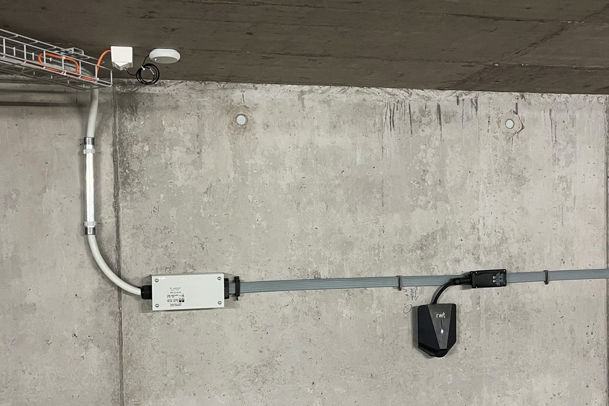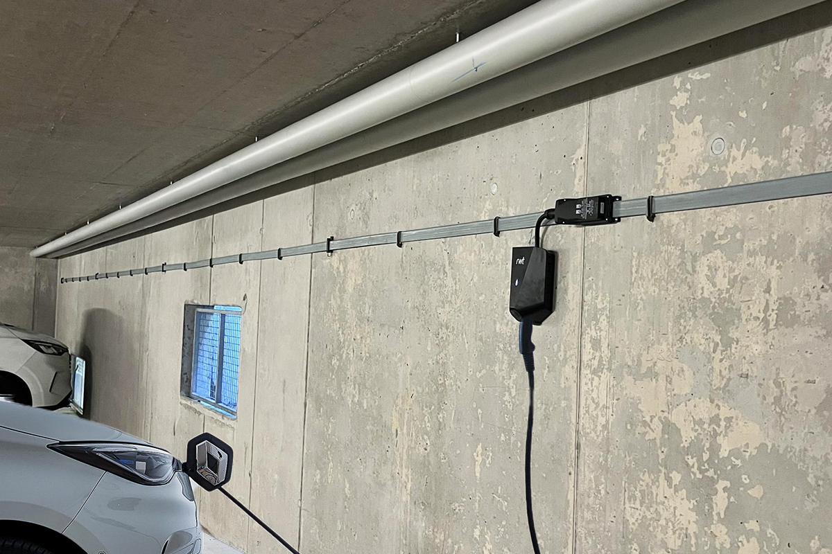 Alle Parkplätze wurden mit einem Flachbandkabelsystem erschlossen, sieben davon mit einer Ladestation. Dank der vorbereiteten Infrastruktur können weitere Ladestationen künftig einfach nachgerüstet werden.